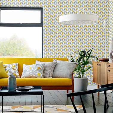 Love birds meet to create a fun geometric wallcovering, available in three trend driven colour palettes. Lintu design from Scion's...