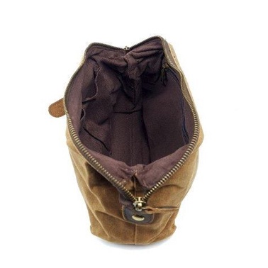The bag is made of canvas and leather, with a zipper securing its main compartment.