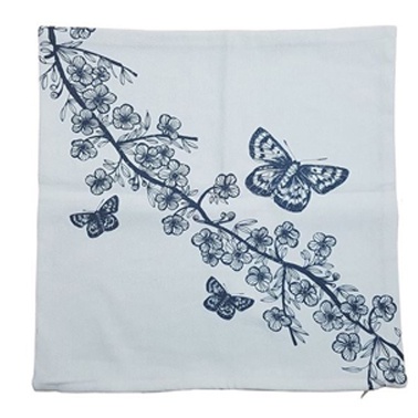 "My Mum is an inspirational traveller and wherever she goes in the world she always collects a piece of blue and white porcelain. Inspired bu this I have decided to develop a series especially for her. This cushion is part of the collection. The Manuka Blue and White collection features the Manuka flower and the Copper Butterfly - each indigenous to New Zealand. The pattern of leaves and flowers create a delicate lace motif." - Jo Luping