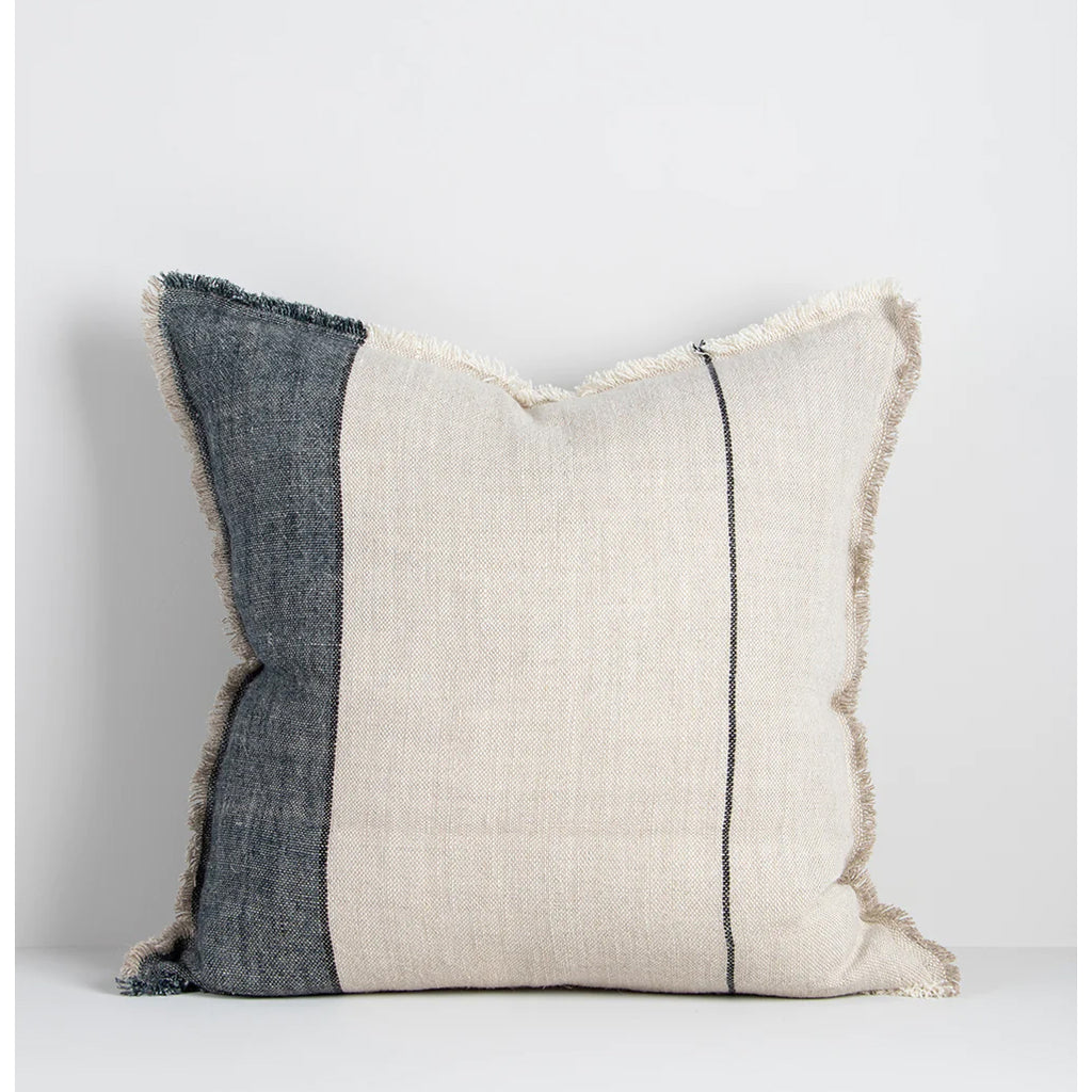 Country charm is given a contemporary twist, with the raw fringing and understated texture of our Frankton cushion. Crafted from thick, textural linen, the asymmetric design creates a modern take on classic style. Shades of ecru and navy create a relaxed feel, and pair effortlessly with Cyprian Oatmeal and Arcadia Cloudburst cushions.